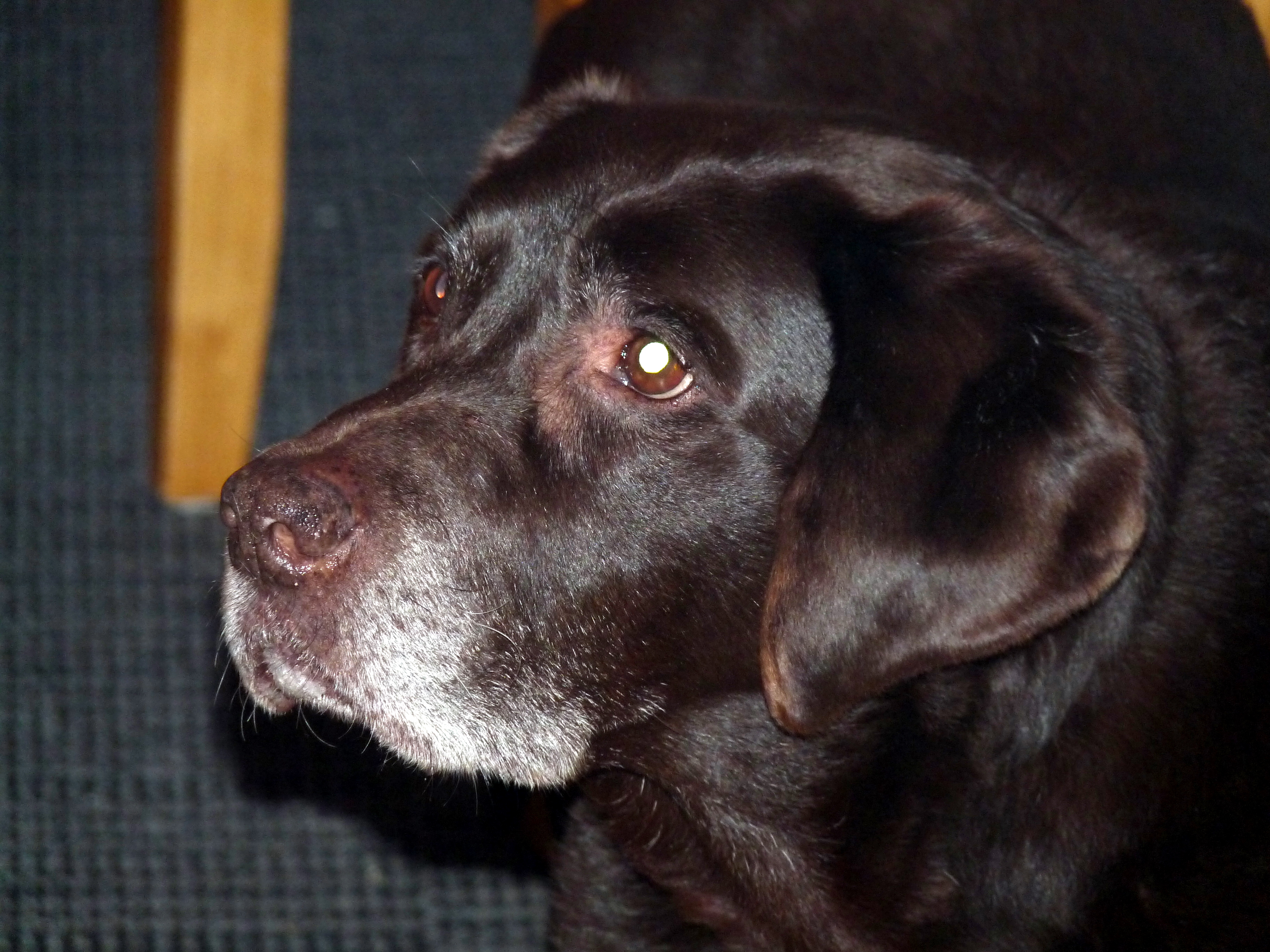 We lost our 12 year old chocolate Lab on Saturday. We were out of town, but Steph was home to bring him to the vet and be there with him. For those who may not know Murphy’s story, ten years ago, also in December, a dog appeared on our porch. He was wearing a collar, but had no tags. The BaldMan and I were attending a funeral, and when the girls called to tell us about him, I suggested they walk him around the neighborhood to see if he’d escaped from somewhere. No luck. I let him sleep on the porch on a blanket that night, as it wasn’t bitterly cold, but Sunday was turning colder. I didn’t want to bring him in the house and freak the cats, as I was sure someone had to be missing this very nice dog. So, Animal Control being closed for the weekend, we called the police. They sent a K-9 car to pick him up. After asking what would happen to him, the officer said he really didn’t know, but that Animal Control would get custody in the morning, and suggested we call then. The AC officer said they would keep him for 10 days, to see if he was claimed by an owner, and after that, as he was a well-behaved and good dog, he’d be available for adoption. We said we would take him. Ten days later, Murphy came home.
