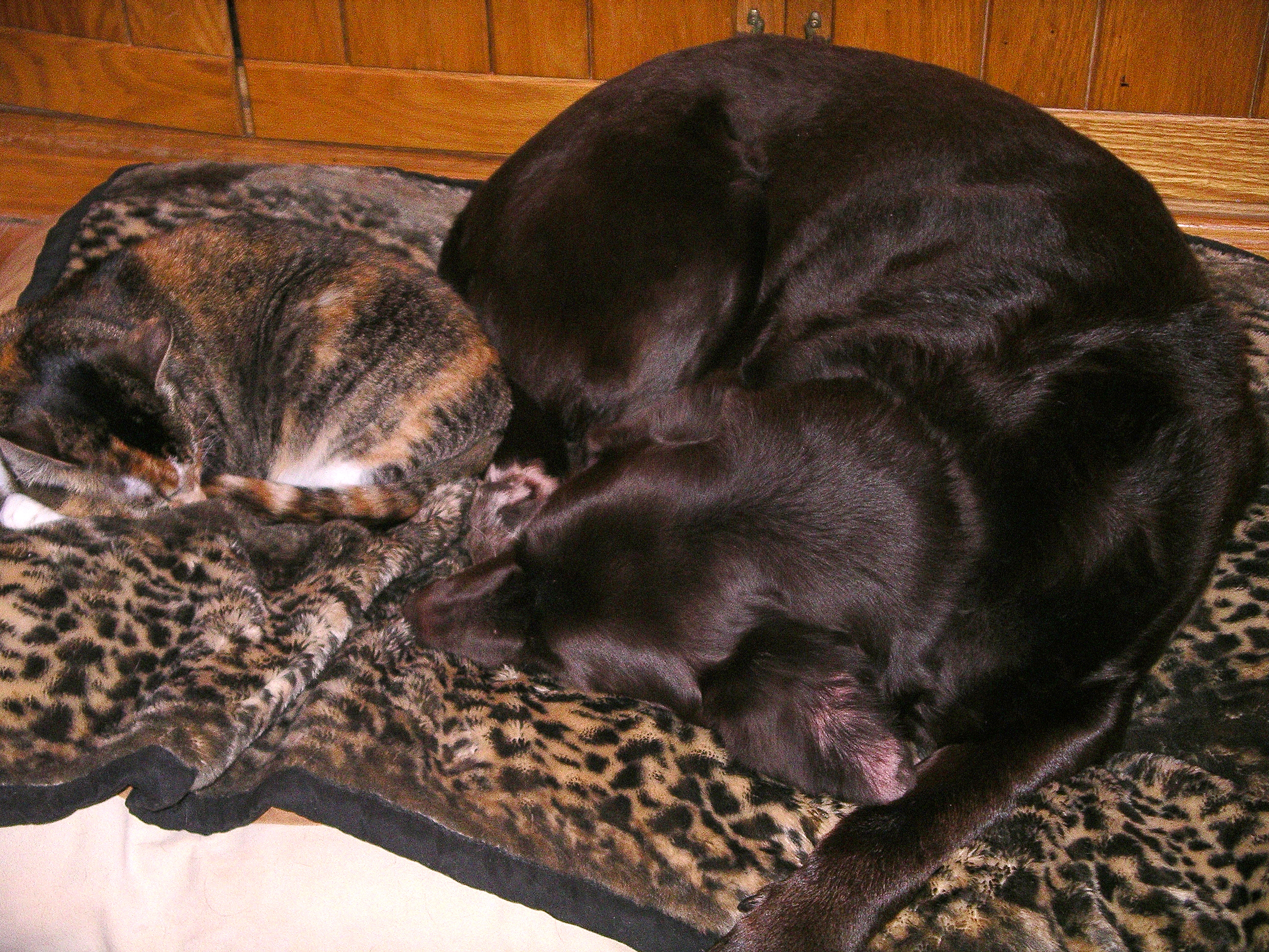 He was a good dog. He was housebroken, and knew some basic commands, and he was pretty good on leash, as well. It appeared that he was just dumped off somewhere, presumably because someone didn’t want him anymore. I never understood that. Oh, he had his quirks. It seemed he’d missed out on the Retriever part of the Labrador Retriever in his genetic background, because he never did enjoy that sort of thing. In fact, he didn’t really like to take toys in his mouth at all. He would play tug for a while, and sometimes run off with a ball or other toy, but he just wasn’t into the whole fetch thing. It was okay, because he was more than tolerant of the cats, including the one who absolutely loved him. Amber would follow him around, rub against him, jump up to head butt him, and he just let her. He would even let her sleep on his bed with him, provided he was there first and already asleep! He never bothered the chickens, and he has always been great with the grandkids. He was quiet, laid back, and just a very good dog.