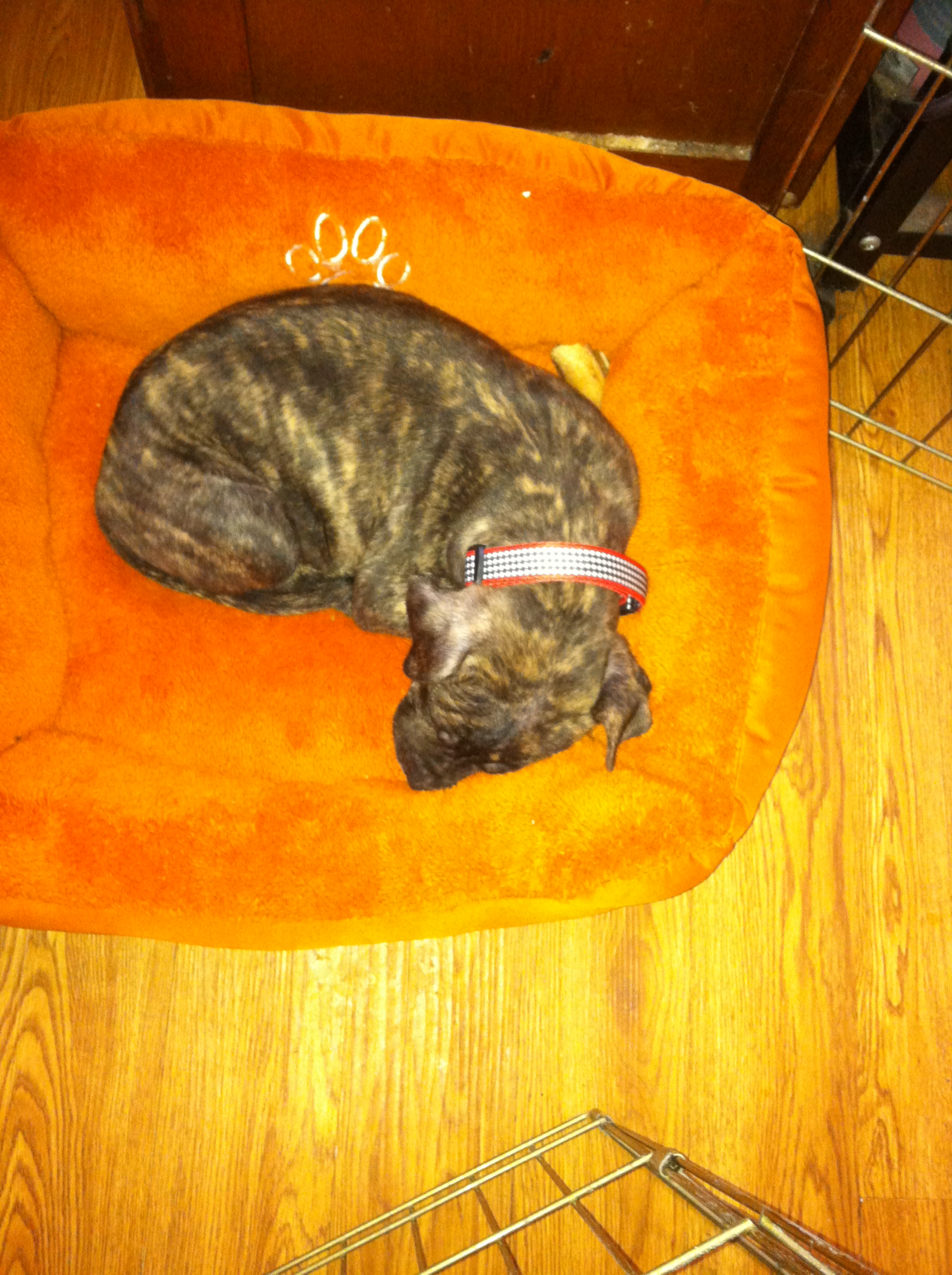 They opened at noon, and we got there about a quarter to. There were a few cars in the lot, and when people started heading to line up at the door, we did, too. Turns out we got in first for the puppies, so we got first choice. We talked to an adoption counselor, and she took us to see the puppies. They were all cute, of course. Some black and white, gray, a red brindle that seemed kind of muted in color, and a very handsome dark brindle. I’m a big fan of brindles, so, of course, he was my choice, and the BaldMan agreed. So they got him out of the pen, and took us to a room so we could interact with him for a bit. He’s a puppy, so he was curious, and bouncy, and lovey, and snuggly, all at once. We talked with the counselor about dogs, and I’ve had experience with puppies before, so that was a plus. After just a few minutes, she said, “So, what do you think? Sold?” We both said, “Yes!”