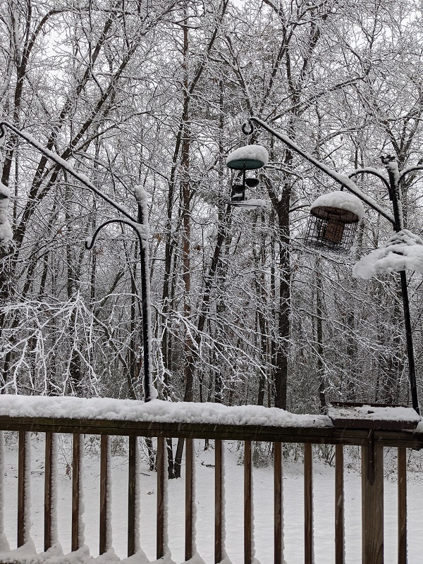 We got our first significant snow of the season on Saturday. It started as rain, and progressed to a heavy, wet snow that lasted most of the afternoon. We got maybe six inches or so? A lot of branches down and a few trees here. This is what it looked like off the deck: