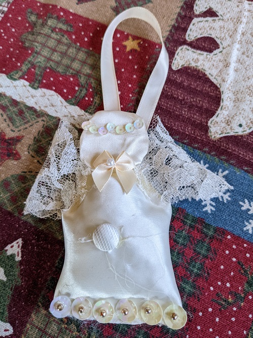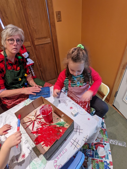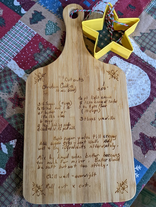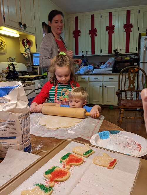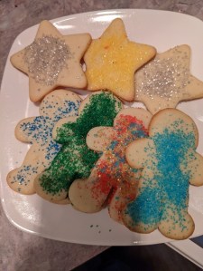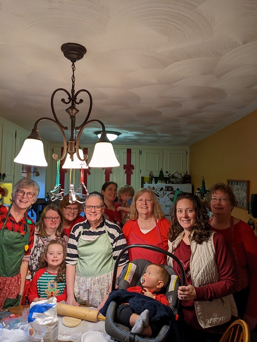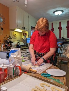 Ellen had wooden cutting boards made with the cookie dough recipe on them in Mom’s handwriting. We lost Mom in May, so that was a nice thing to have. She also make angel ornaments from Mom’s wedding dress. The actual baking is a production line process, if a little less efficient than a factory line would be! One person at the head of the table, rolling and cutting the cookies. The rest of the table has the decorators seated around it with a selection of colored sugars and other things to make the cookies pretty. And Cathi is the head baker, in charge of the oven. I don’t know exactly how many cookies we ended up baking but there was a good pile of bags with a couple dozen in each. Everyone gets to take one home. And, of course, there was a lot of laughing, a bit of teasing and good-natured ribbing- family stuff, right? It made for a good afternoon of holiday fun.