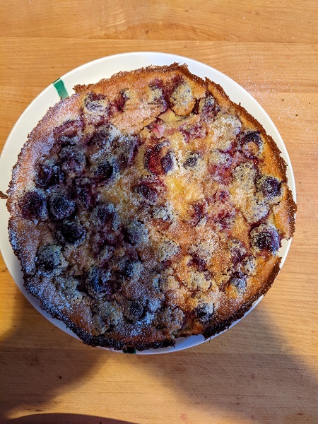 It’s cherry season! Cherries are one of my favorite fruits. They are expensive, but for a treat while they are in season, I do buy them. We had the in-laws over for dinner on Sunday. We made pizzas on the grill, and I made a polenta cherry cake for dessert. It’s a nice, light cake, good for summer, and gluten free so Steph can have it, too. It’s also pretty easy to make, other than pitting the cherries.