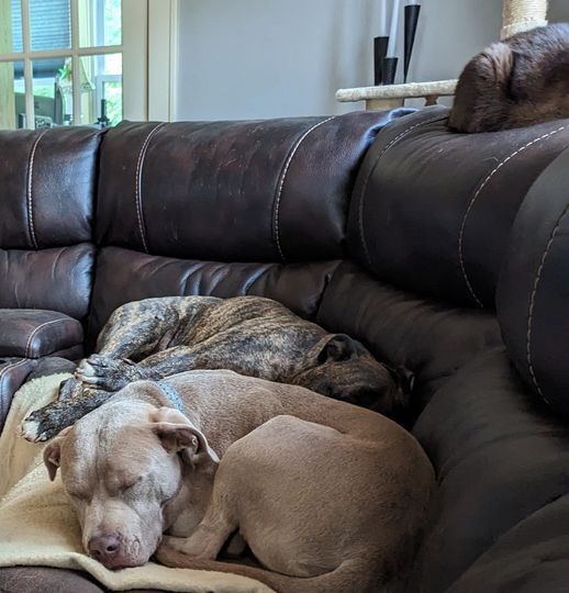 That is Tucker in the foreground. We brought him home from the local Humane Society on Friday, the 9th. He’s a year old, and the only information they had on him is “mixed breed”. I have a DNA test kit here on my desk to find out more. And that’s Lambeau, our 9-year-old APBT, behind him. They are getting along well, and he’s even very good with the cat. I will post more next week, but for now, we are working on crate training, recognizing his name and the clicker, and potty training. I am looking into obedience classes because I could use the refresher on training myself.