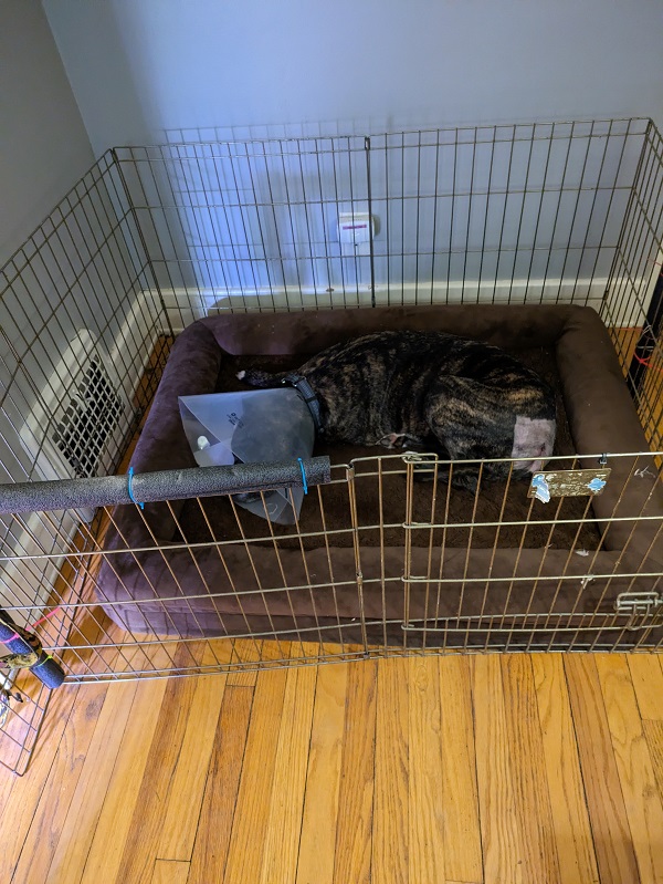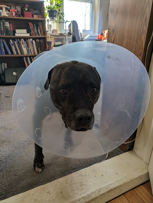 He’s tolerating the collar pretty well. He does hate being locked up and not able to run and play with Tucker. I did take him for a short, slow walk this morning just to stretch his legs a bit.